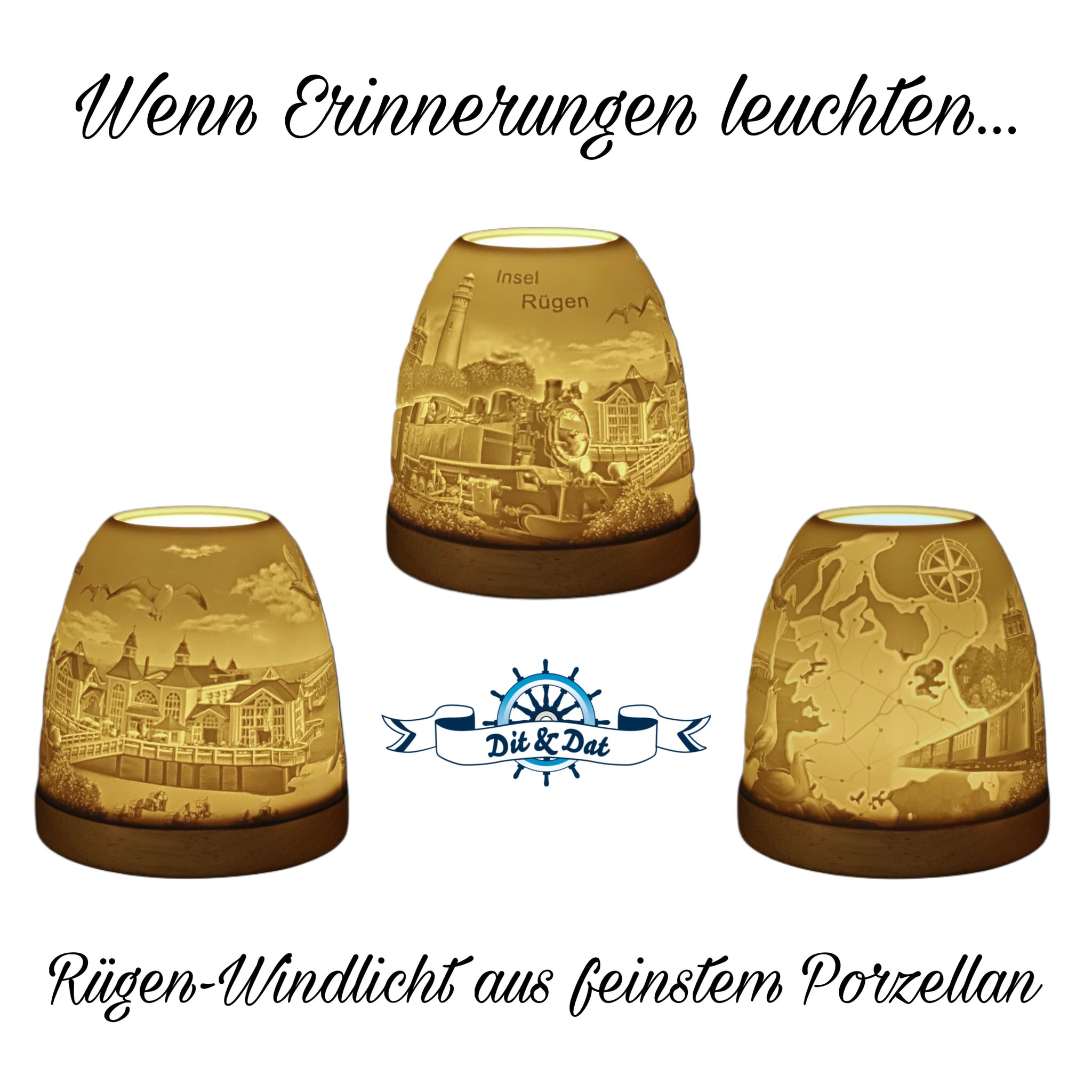 Porzellan-Windlicht Insel Rügen mit Inselumriss,  beleuchtet.